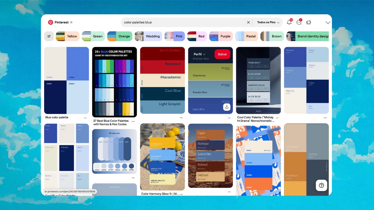 É muito difícil combinar cores, então uma dica é pegar paletas prontas na internet (existem várias por aí). Busquei também ‘Color palettes blue’ para encontrar paletas de cores azuis. Você pode buscar a cor que você quiser.