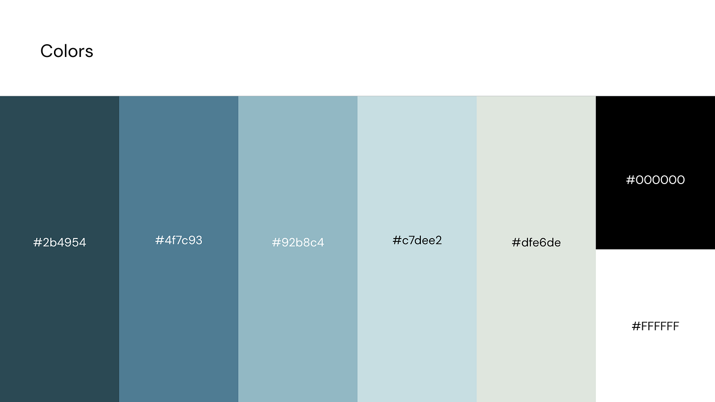 Peguei as paletas de cores que eu salvei de referência do Pinterest, e criei a minha própria paleta de cores no meu brandbook. Importante ter o código #HEX de cada cor para você poder usar de referência no futuro.