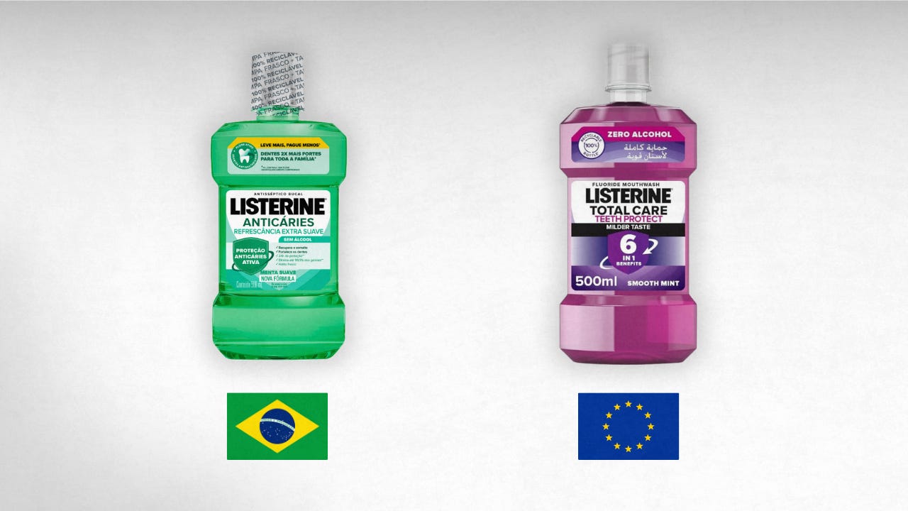 Quer um exemplo ainda mais interessante? A Listerine — que é uma marca que trabalhei por muitos anos — muda a cor do enxaguante bucal dependendo do país, justamente para não ser confundida com outros produtos locais. Aqui no Brasil temos aquele verde, mas em alguns lugares da Europa a Listerine é roxa.