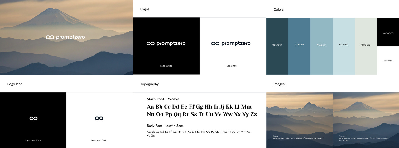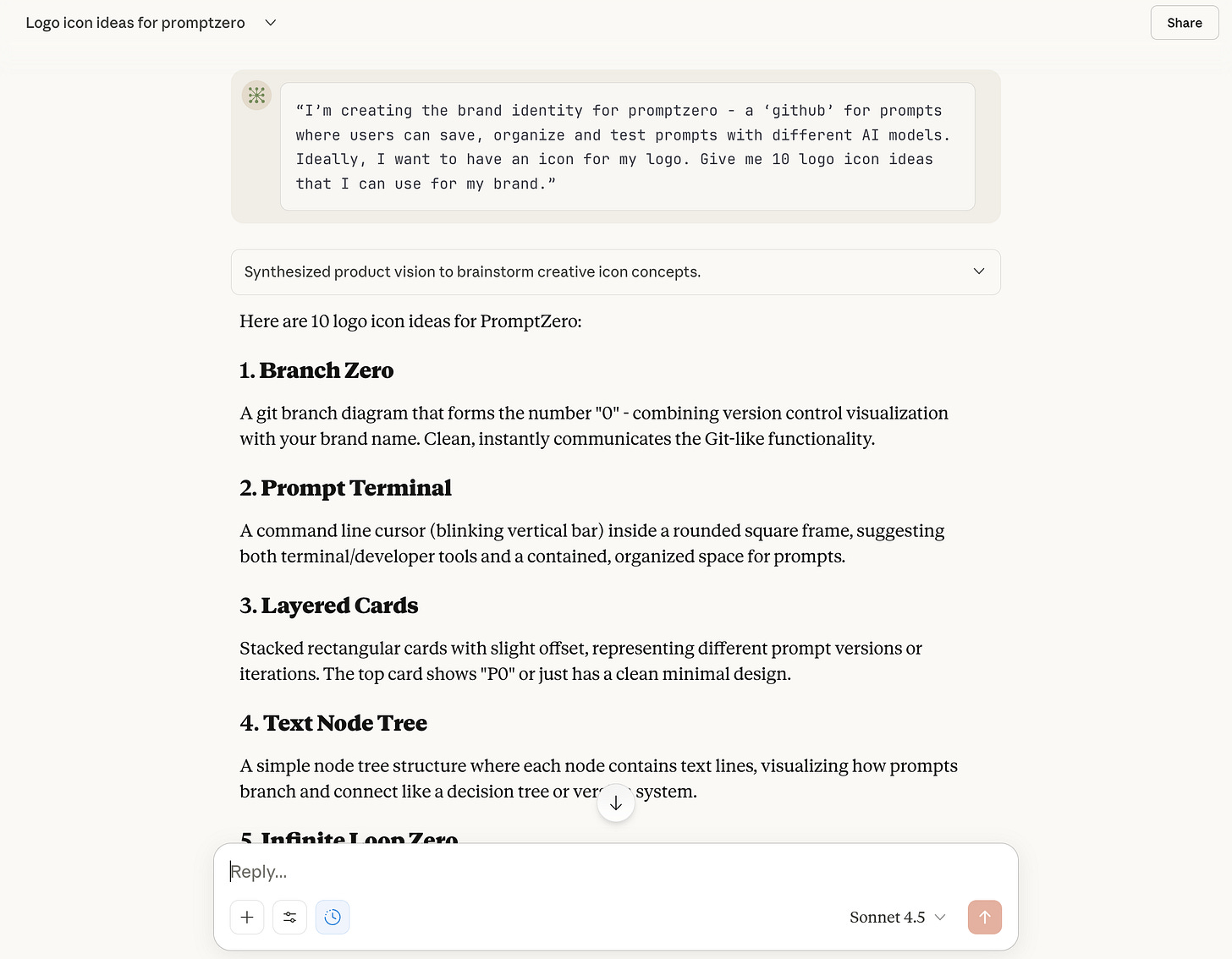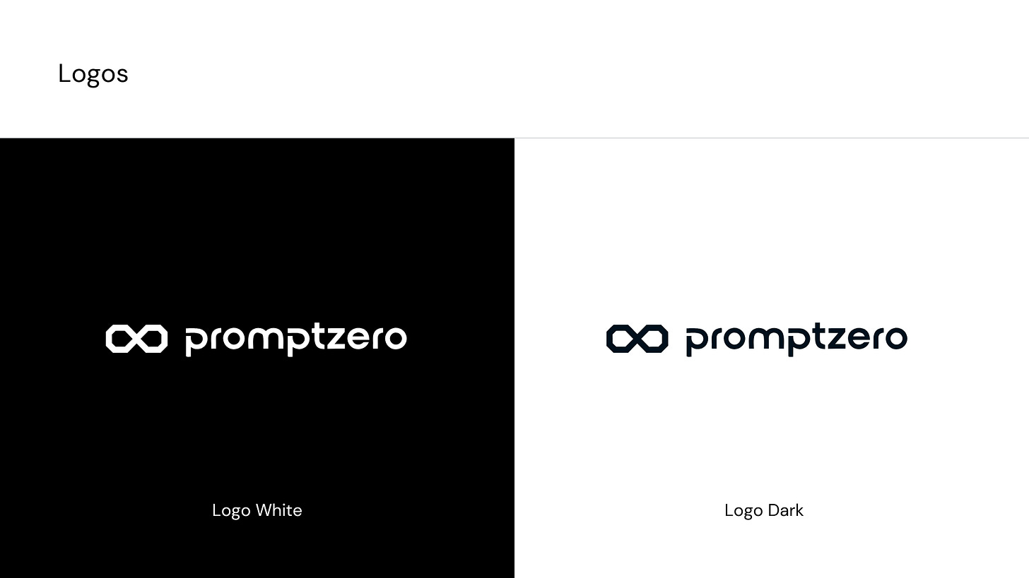 “I’m creating the brand identity for promptzero - a ‘github’ for prompts where users can save, organize and test prompts with different AI models. Ideally, I want to have an icon for my logo. Give me 10 logo icon ideas that I can use for my brand.”Ele me devolveu algumas opções de ícones para o meu logo e eu escolhi a opção ‘Infinity Loop’, que é aquele símbolo do infinito.