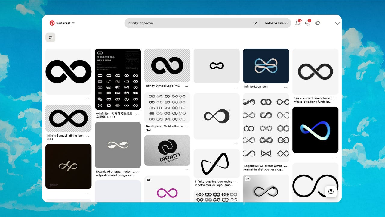 Busquei pela palavra-chave ‘Infinity loop icon’. Você pode repetir exatamente essa mesma busca trocando ‘infinity loop’ pelo seu próprio ícone. Quando encontrar algo que te agrade, salve no seu computador.