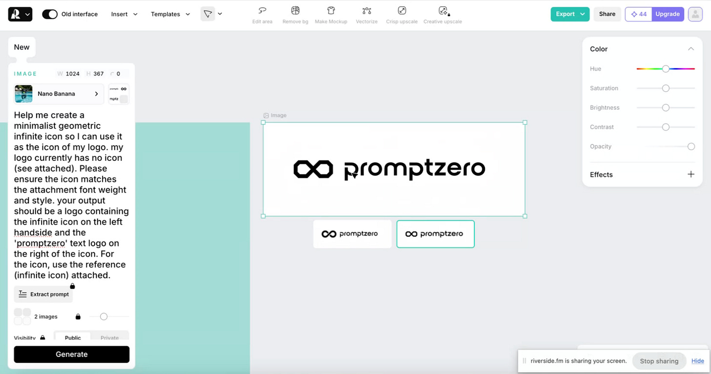 “Help me create a minimalist geometric infinite icon so I can use it as the icon of my logo. my logo currently has no icon (see attached). Please ensure the icon matches the attachment font weight and style. your output should be a logo containing the infinite icon on the left handside and the ‘promptzero’ text logo on the right of the icon. For the icon, use the reference (infinite icon) attached.”Anexei junto com esse logo: o ícone que eu salvei como referência do pinterest e o logo tipográfico que eu criei no Canva. Usei o modelo Nano Banana.