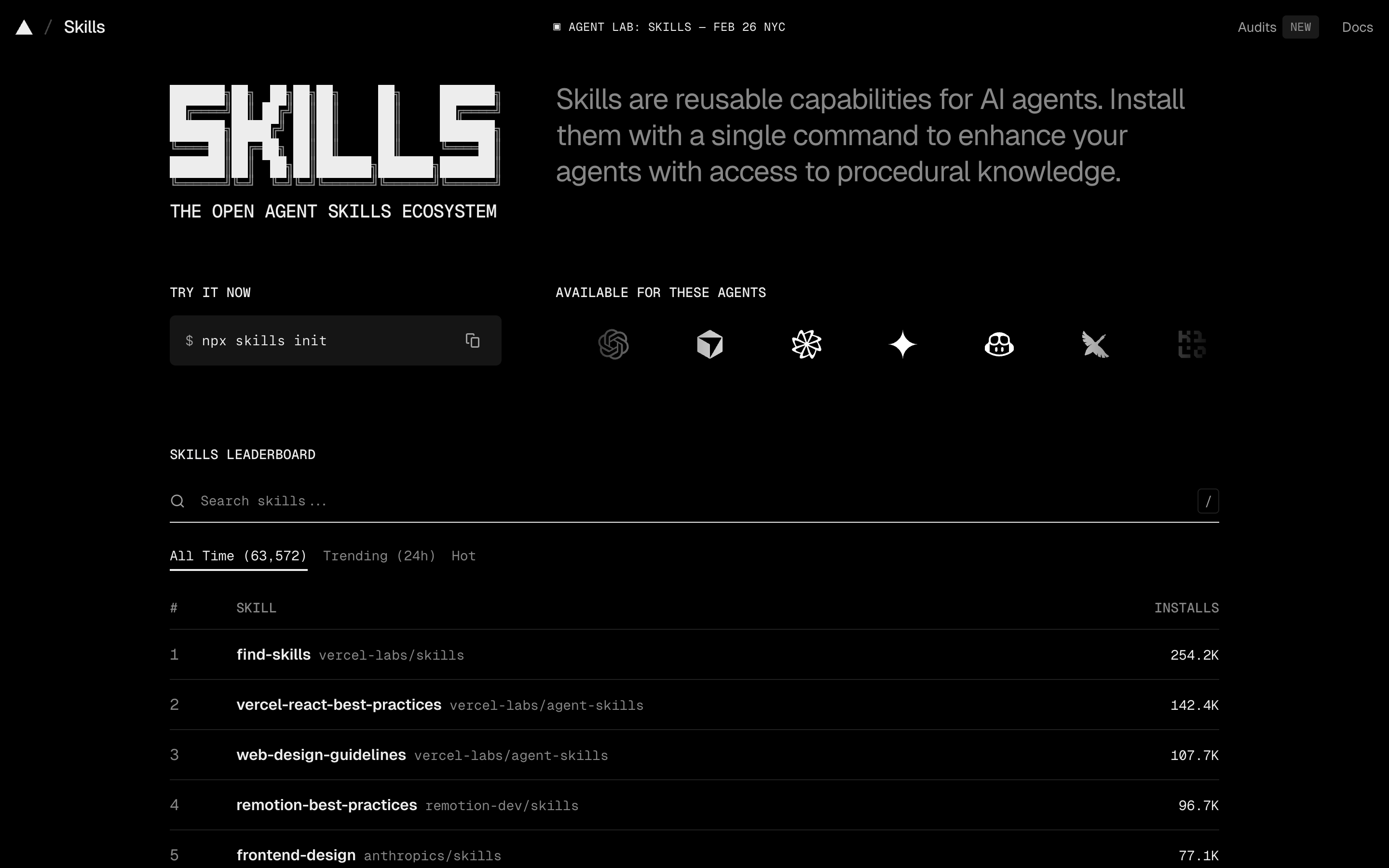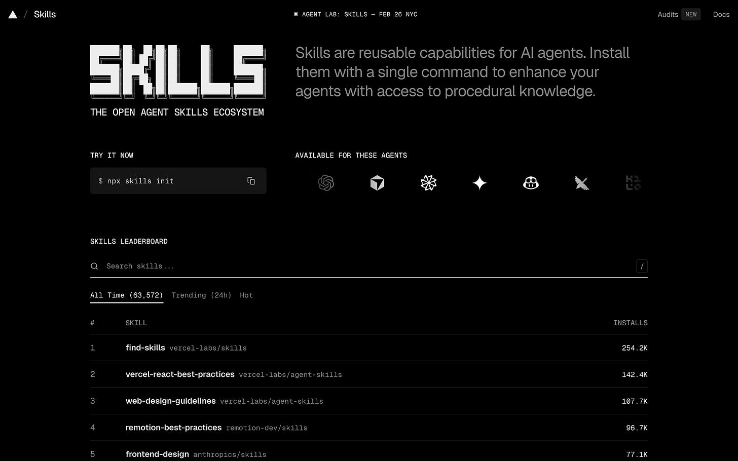 A instalação é super simples. Existem vários diretórios de skills por aí, mas eu gosto muito do skills.sh (feito pela Vercel). Ele também mostra quantas instalações cada skill teve - o que ajuda a identificar quais skills realmente valem a pena.