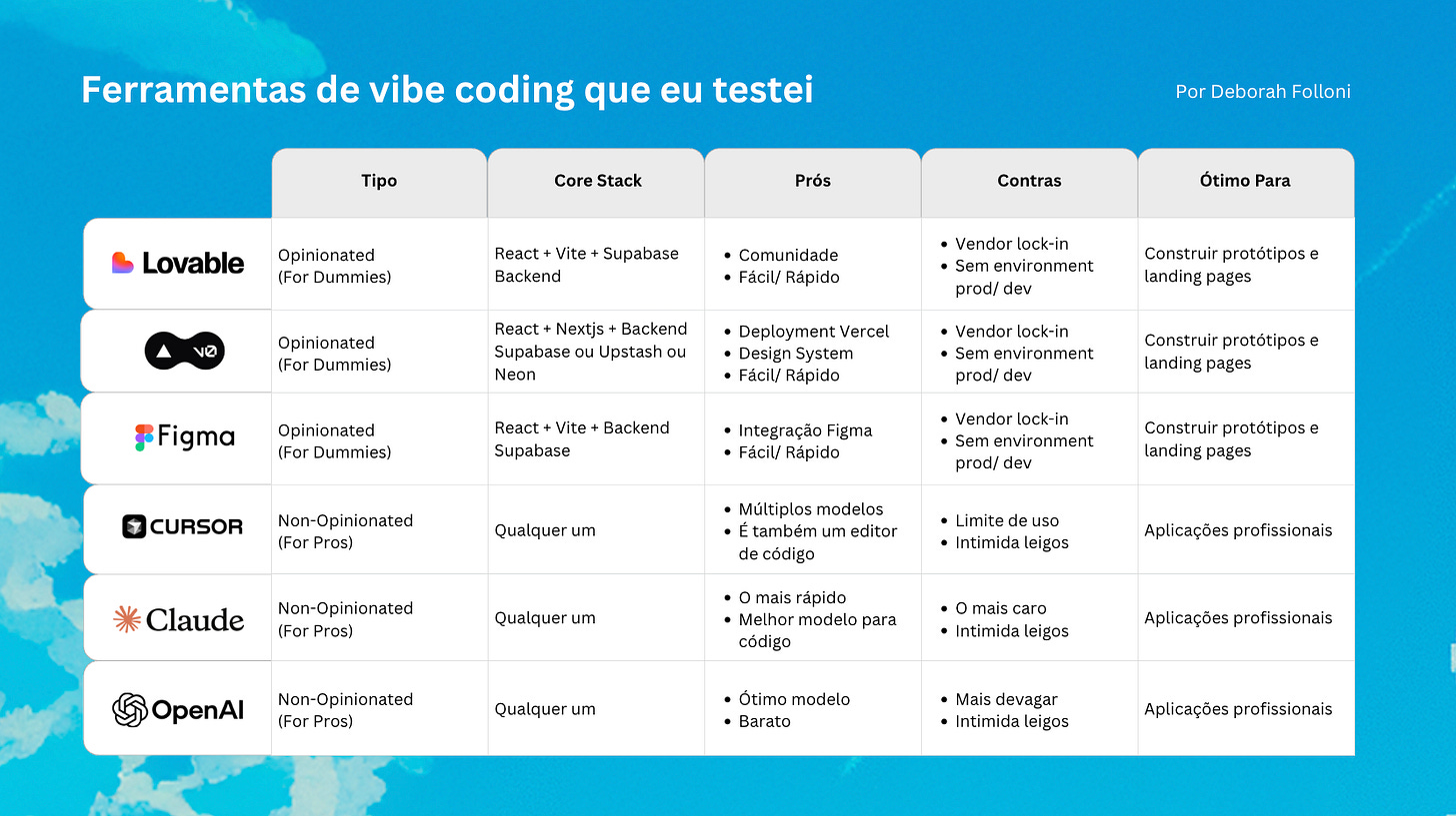 Nos últimos meses eu gastei mais de R$ 10.000 em tokens testando vários os coding assistants do mercado. Para ser mais exata, foram 6: Lovable, v0, Figma Make, Cursor, Open AI (Codex) e Claude Code.